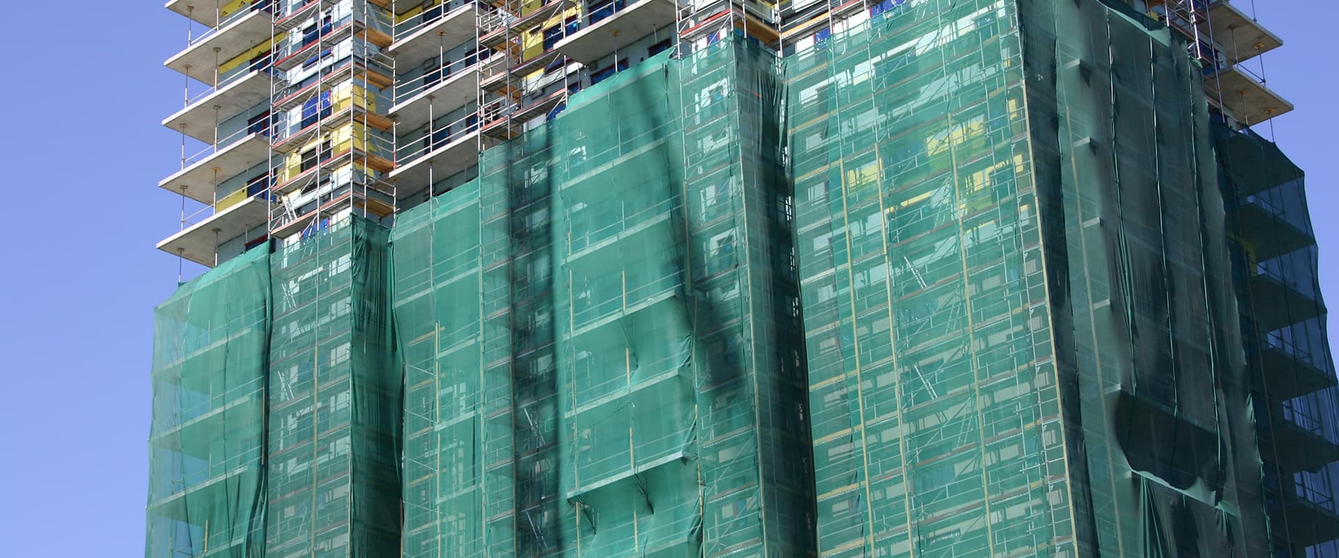 Protective scaffolding enclosure, visual safety barrier, guardrail debris protection, construction windscreen, demolition, dust and debris control, building wrap enclosure, special event staging or fencing, and shade cloth.