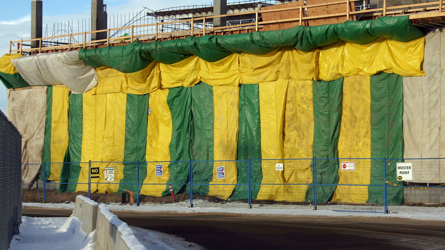 Norseman worked on a solution with the construction company to develop a system that would work year-round, keep their site safe, and operating optimally. The solution was a combination of Interlocking Hoarding Tarps, Debris Netting, and Insulated Blankets. The Interlocking Hoarding Tarp provided a temporary external barrier for the project. The Debris Netting prevented any tools or building materials from falling preventing potential damage to nearby properties or injuries to passersby. Lastly, Norseman provided Insulated Blankets to help keep the worksites at an optimal temperature during the cold winter months.