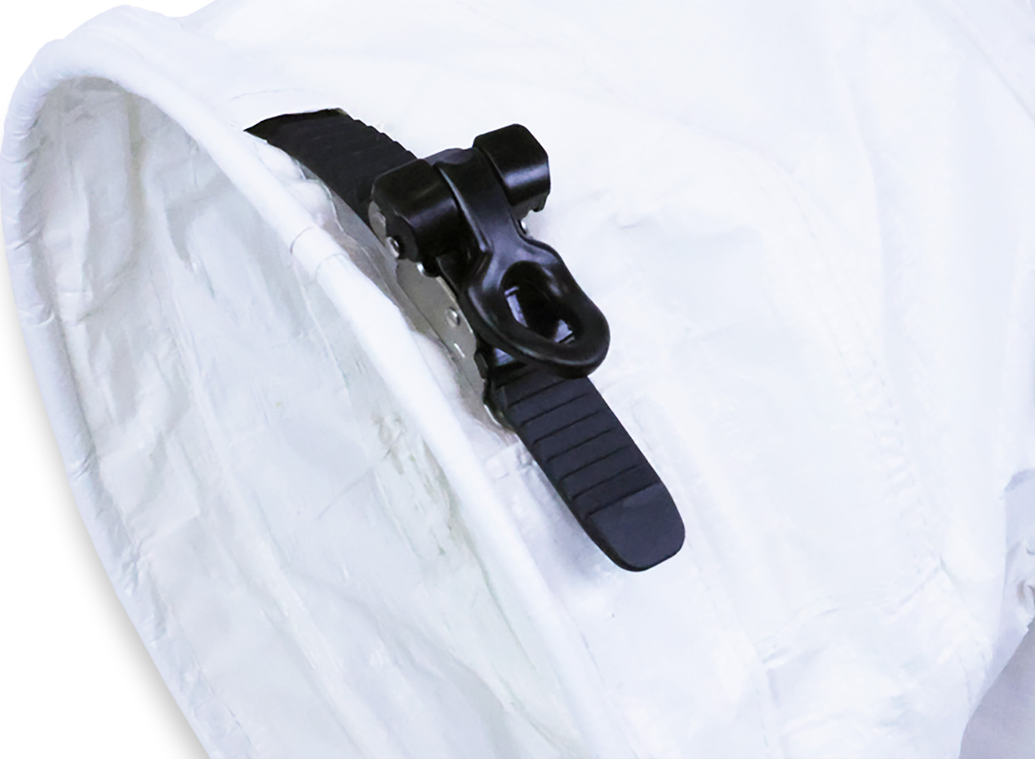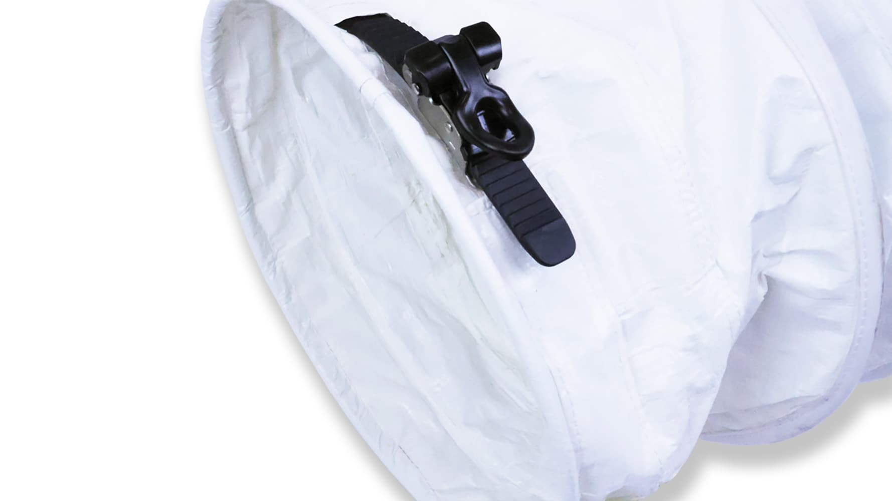 Las lengüetas de suspensión integradas permiten sujetar el conducto desde arriba, y las correas de compresión adjuntas facilitan su embalaje y almacenamiento.