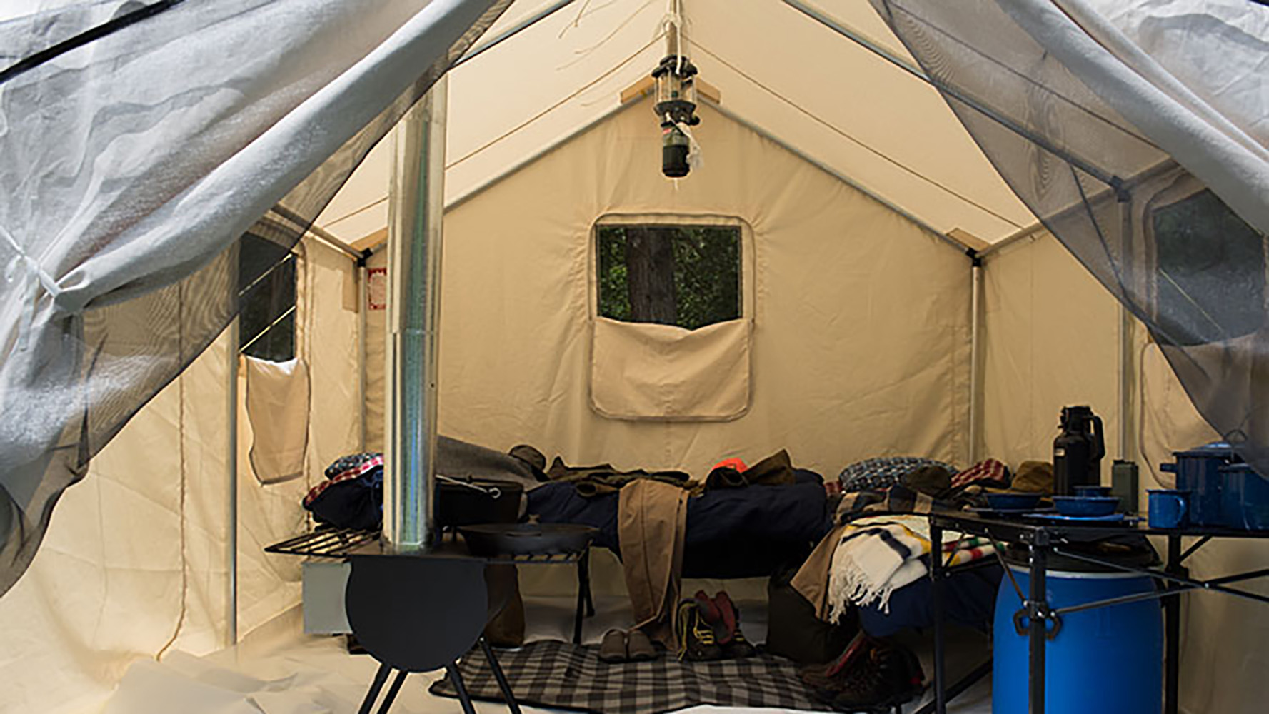 Les tentes murales en toile Norseman's sont fabriquées à partir d'une toile de canard militaire 100 % coton blanc de 11 oz, traitée Sunforger et résistante au feu.