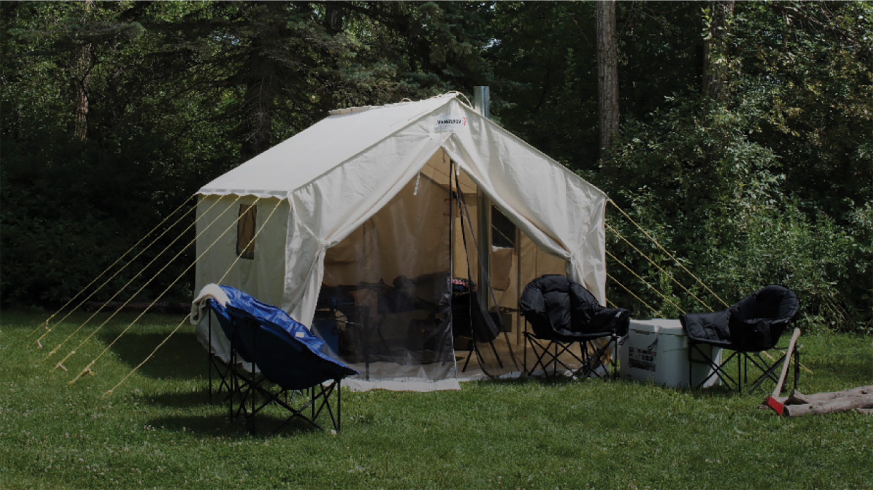Les tentes murales sont portables et polyvalentes, et tous les points de tension sont renforcés dans l'ensemble de la structure. La toile de gazon tissée en polyéthylène assure l'étanchéité du fond de la tente sur un sol irrégulier. Le filet sur les trois fenêtres et la porte avant, ainsi qu'un anneau de tuyau de poêle de 6 pouces, assurent un intérieur confortable quel que soit le temps.